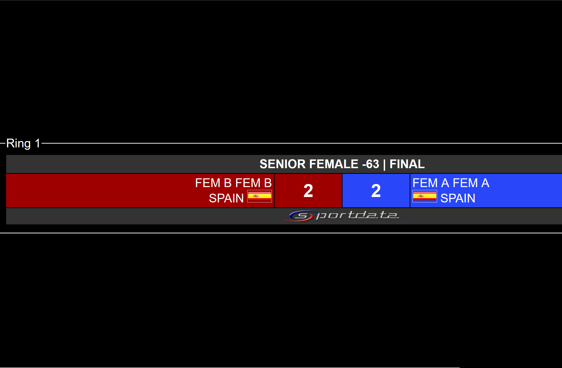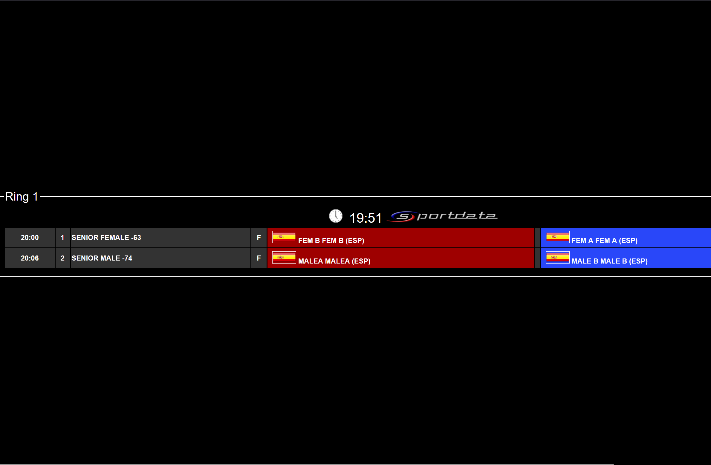 Match Caller Tatami Monitor Live Example: Displays the real-time queue of matches for each tatami, including athlete names and match numbers.
