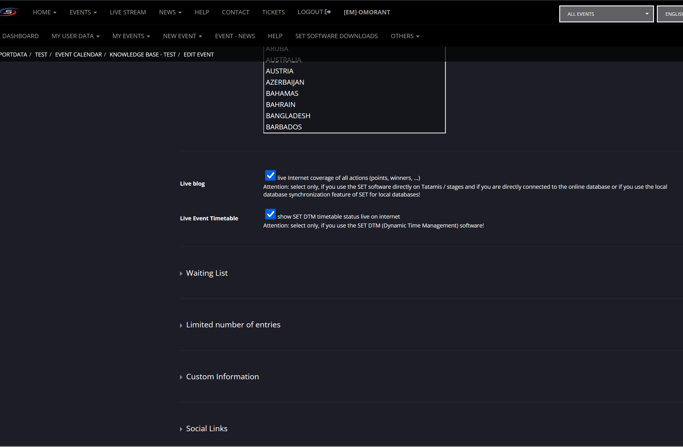 Enable the "Live Blog" and "Live Event Timetable" options.